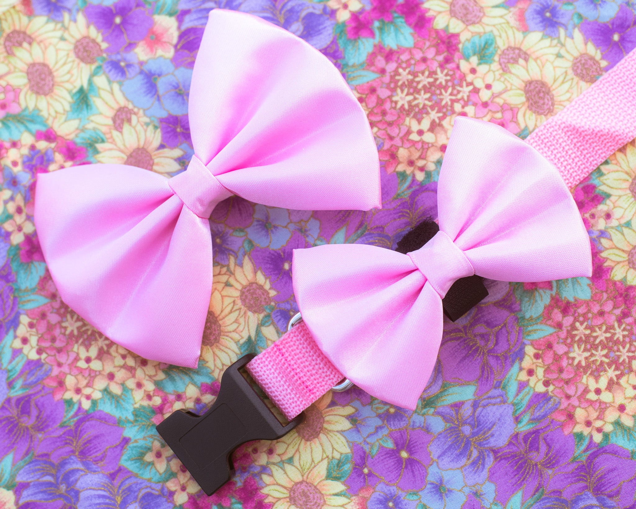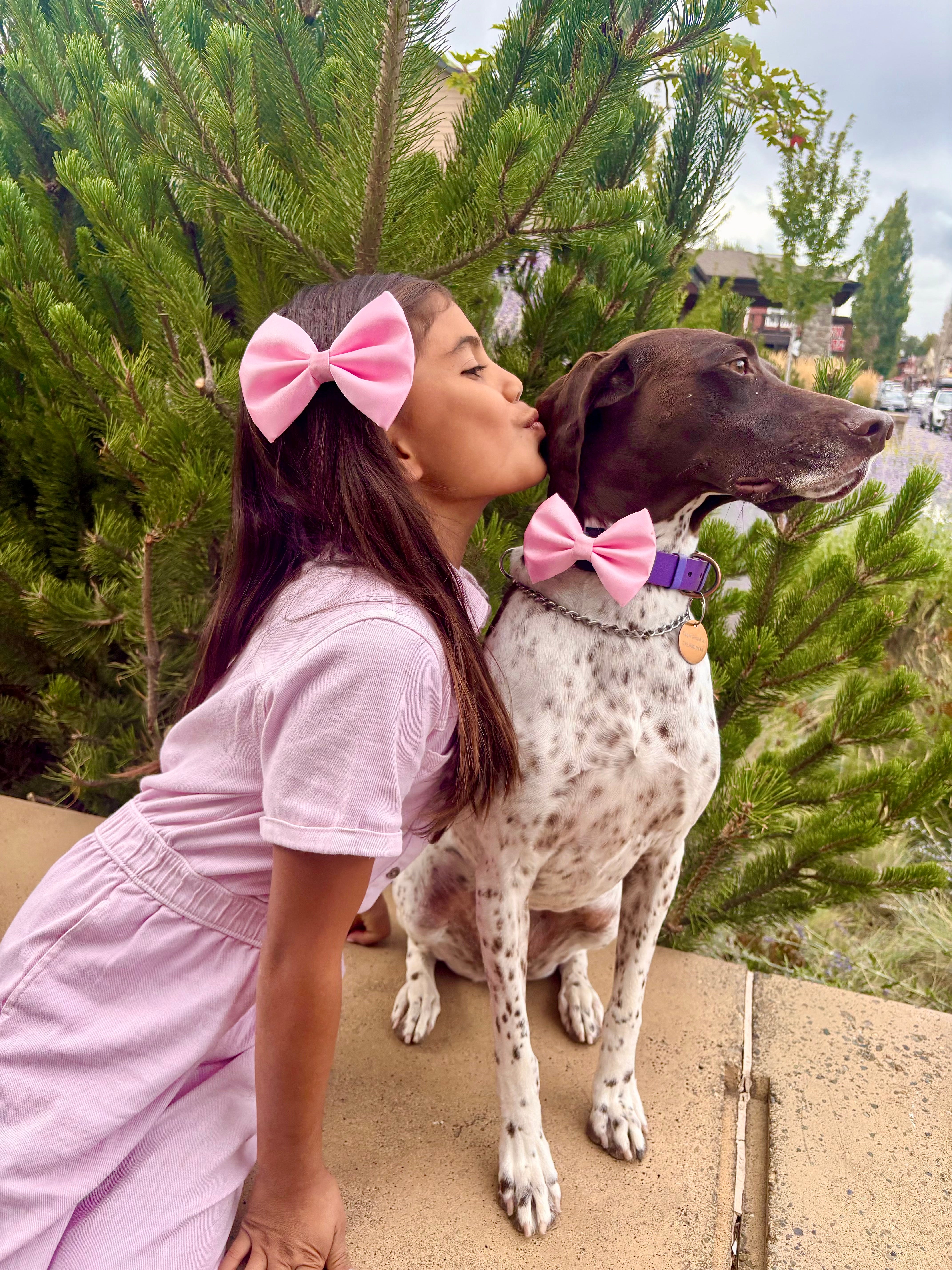 The human bow features an easy-to-wear alligator clip, while your dog’s bow fastens comfortably with Velcro, ensuring you both look and feel great.