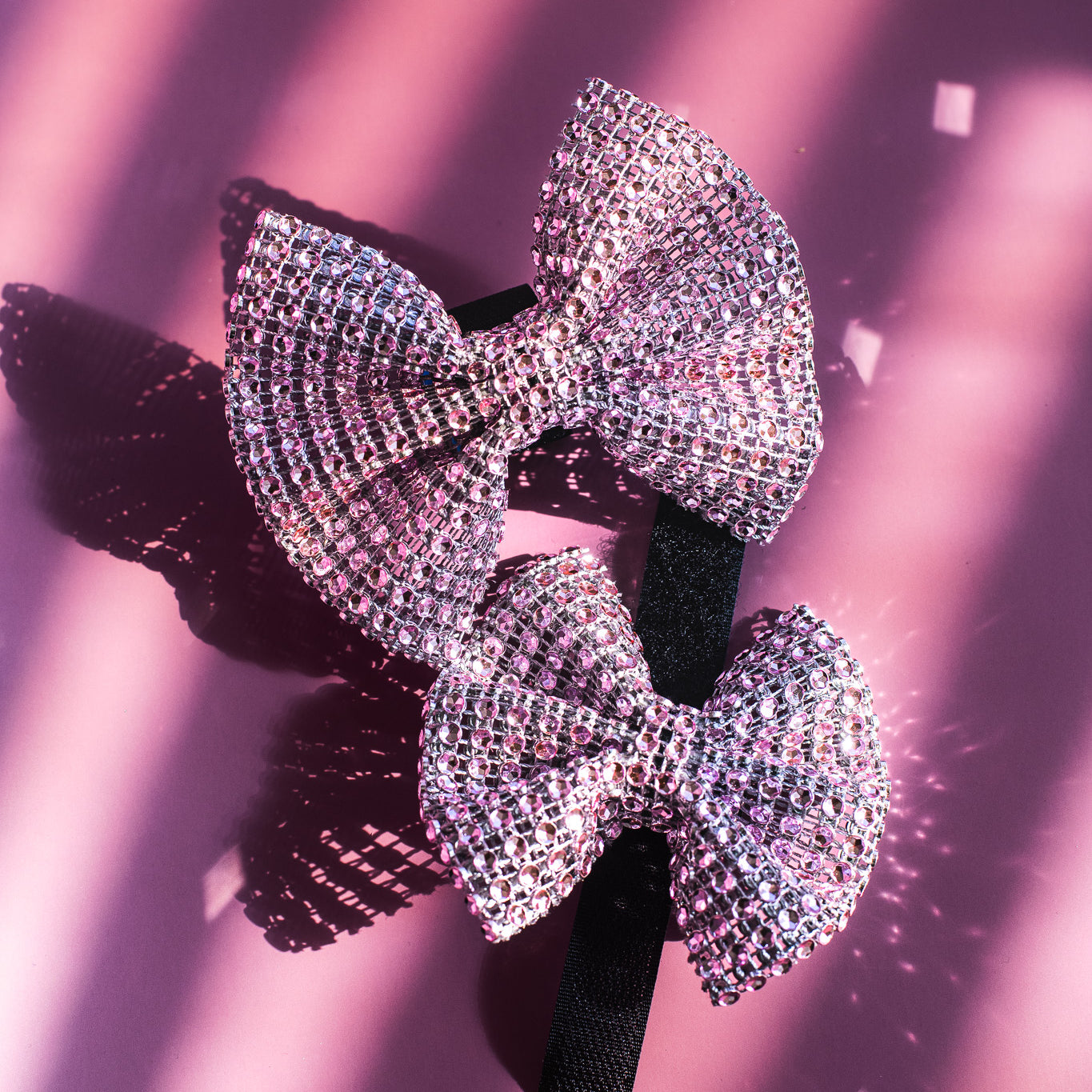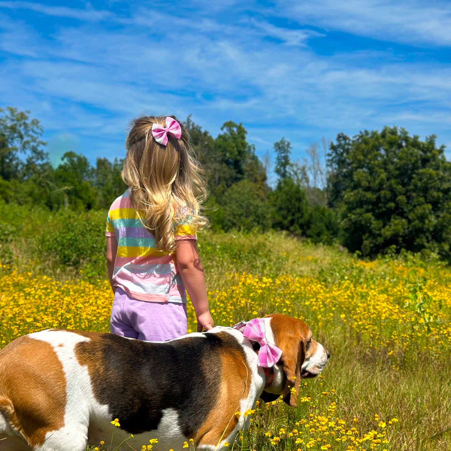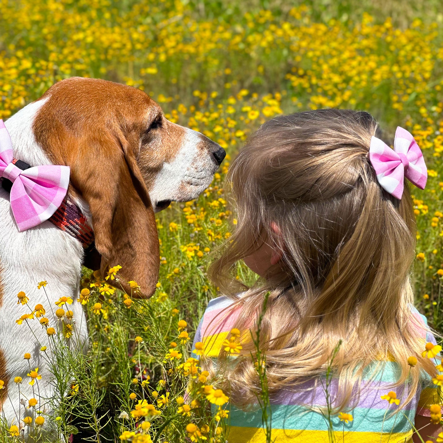 The human bow features an easy-to-wear alligator clip, while your dog’s bow fastens comfortably with Velcro, ensuring you both look and feel great.